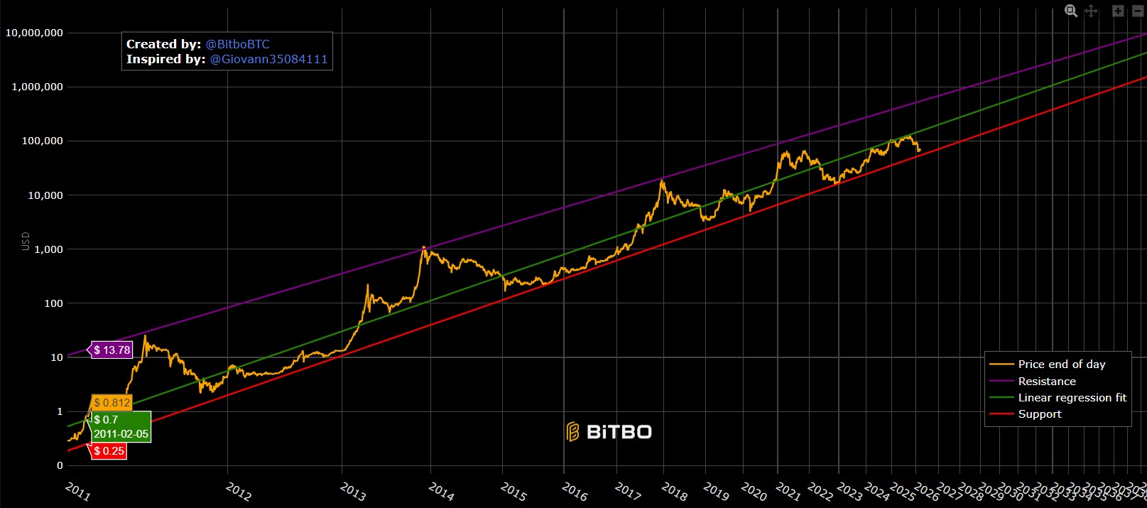 Hoe werkt dit? Neem alle koerspunten van Bitcoin sinds 2009, zet ze op een logaritmische schaal, en bereken welke rechte lijn daar het dichtst langs loopt. Dat is die lijn. Niet getekend op het oog, maar wiskundig berekend als beste samenvatting van vijftien jaar koersdata. De koers beweegt eronder of erboven, maar keert altijd terug.